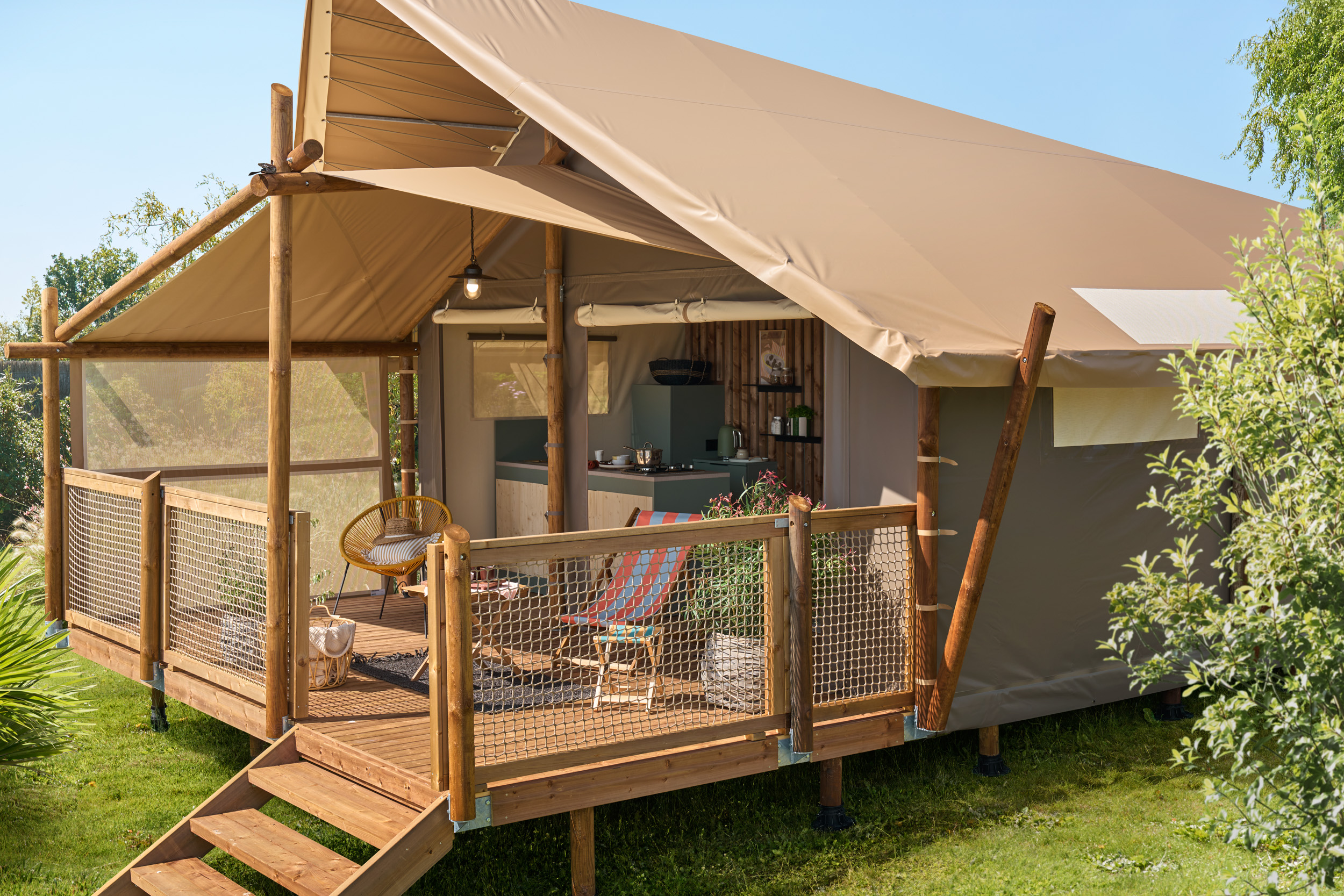 Évadez-vous dans nos lodges toilés trappeur de 34 m², un hébergement insolite qui allie l’authenticité du camping à tout le confort moderne.